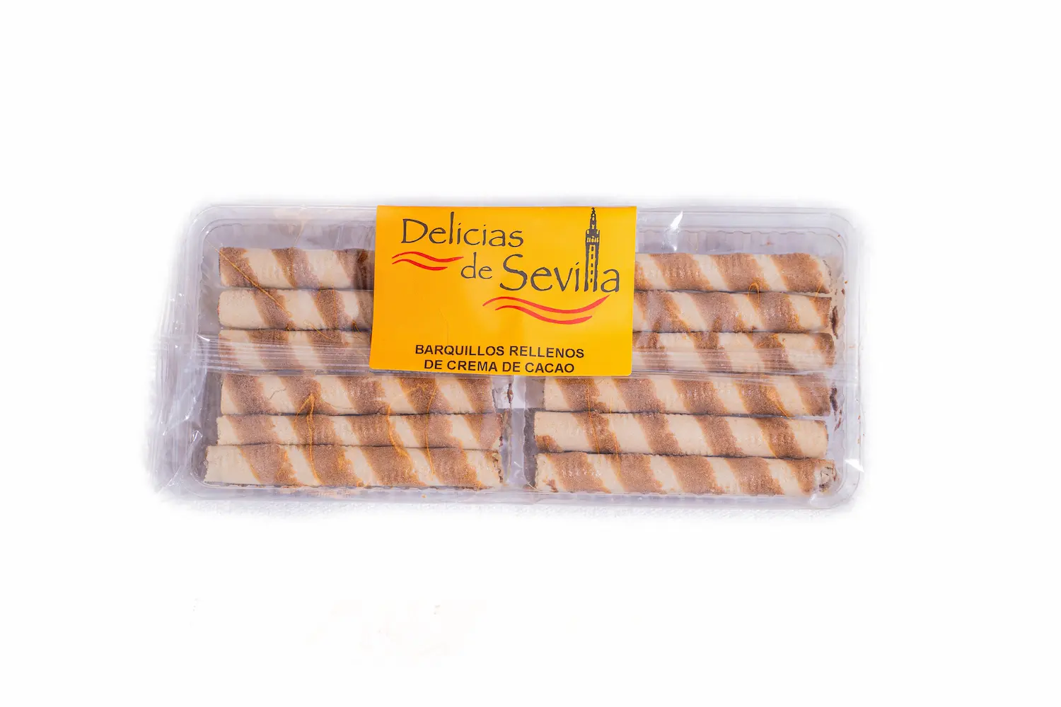 Déjate conquistar por los barquillos rellenos de crema de cacao de Delicias de Sevilla. Esta deliciosa combinación de barquillo ligero y crujiente, con un relleno cremoso y suave de cacao, está pensada para los paladares más golosos. Son ideales para ofrecer en celebraciones, acompañar postres o simplemente disfrutar de un bocado dulce en cualquier momento del día. Su elegante presentación en bandeja mantiene su frescura y los convierte en una opción perfecta para regalar o compartir.